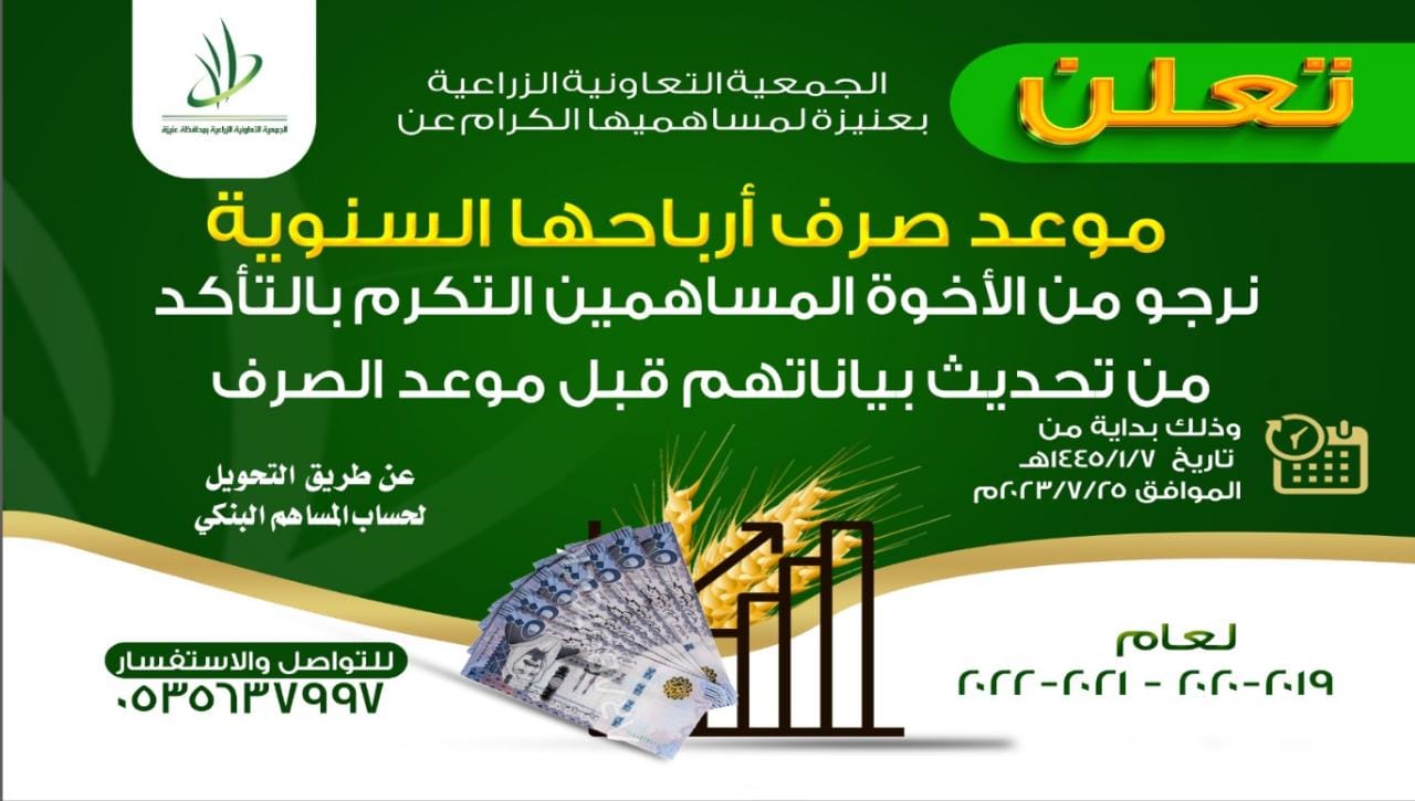 يسر مجلس إدارة الجمعية التعاونية الزراعية في محافظة عنيزة أن يعلن لأعضاء الجمعية العمومية "المساهمين" عن توزيع أرباحها ...